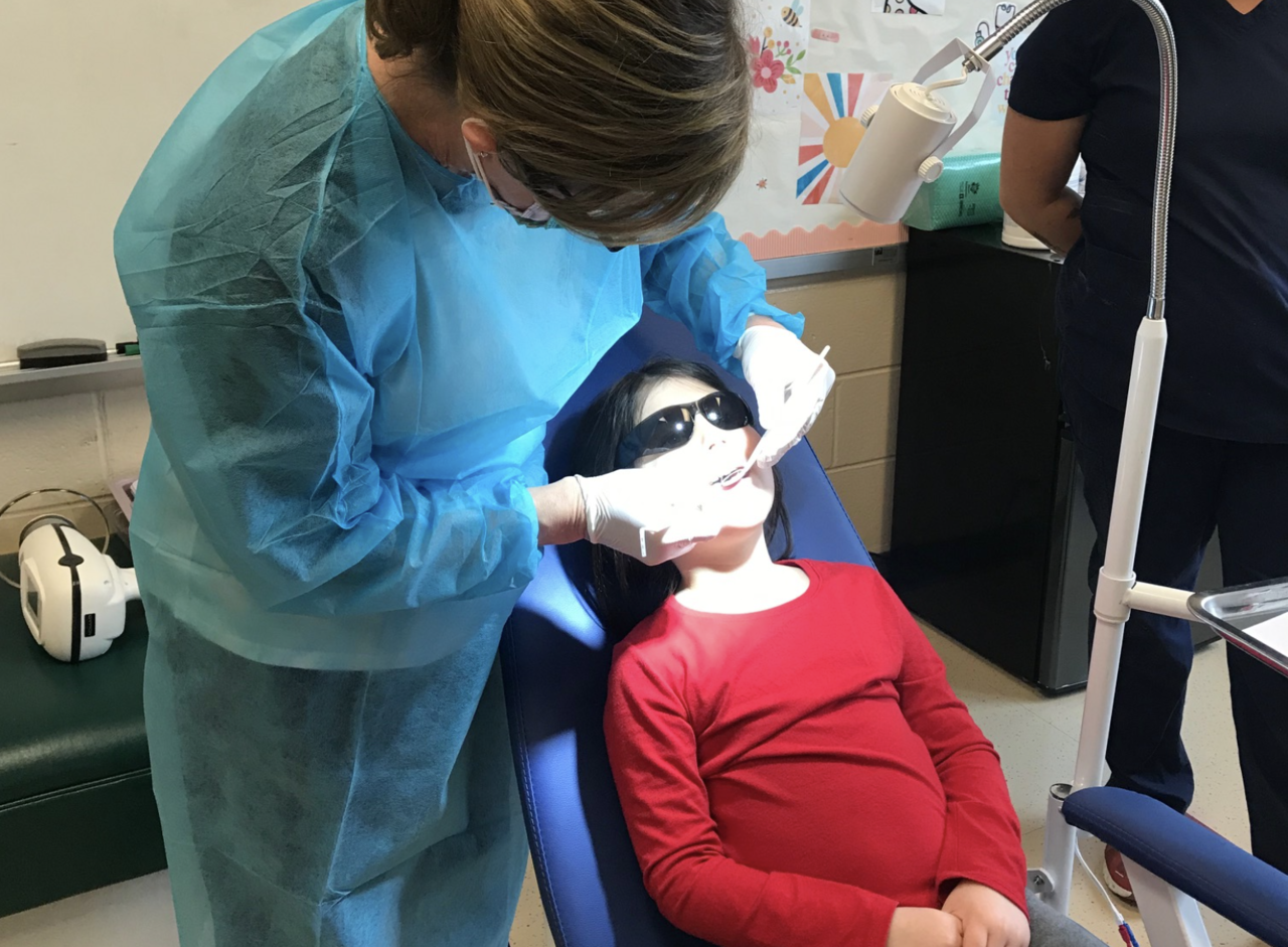 A student receives a dental screening at her school from an Augusta Regional Dental Clinic staff member. The safety-net dental clinic, located in Fishersville, Virginia, reported a 60% increase in new patients after receiving donated resources from America’s ToothFairy. | Image Credit: © America’s ToothFairy