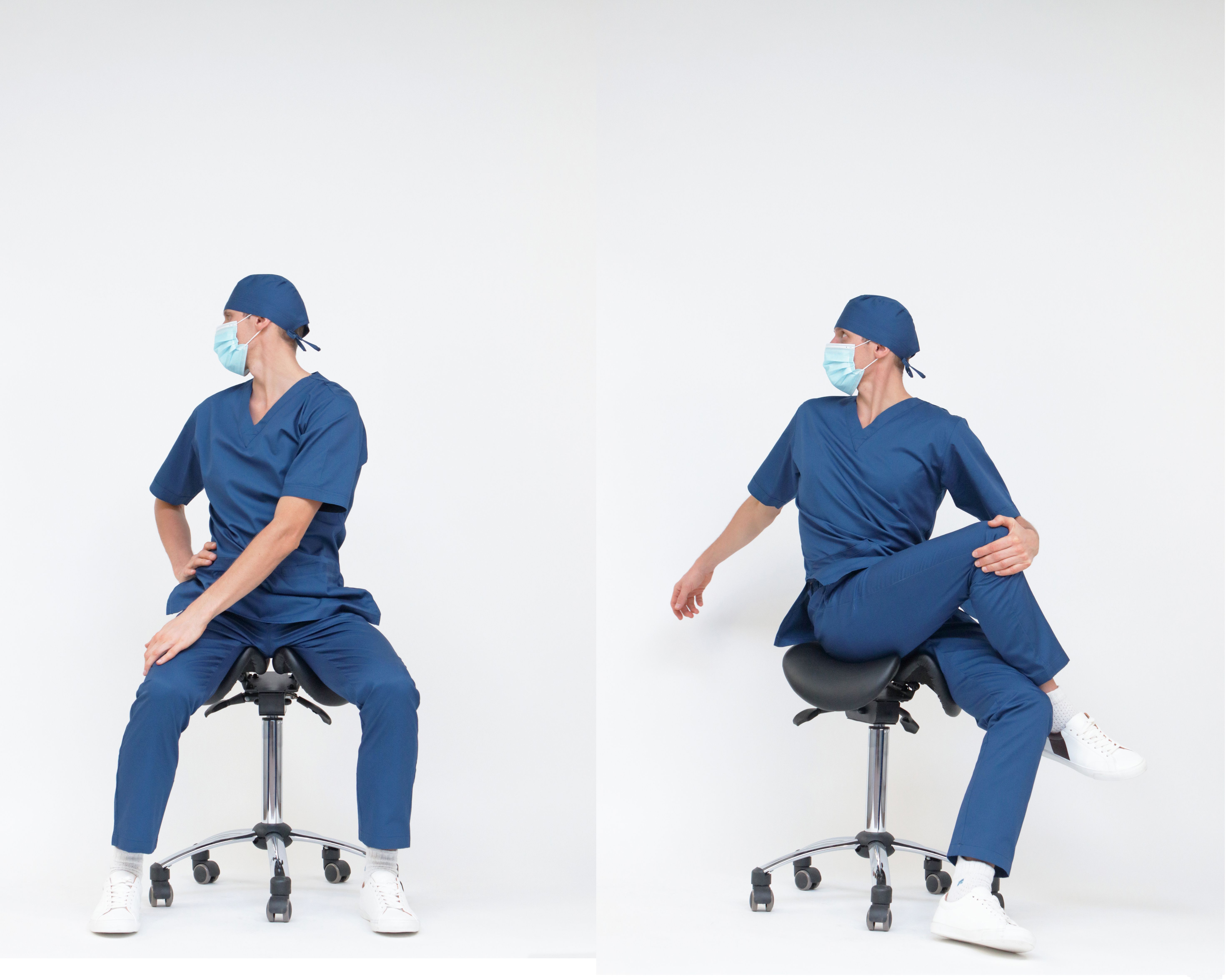 If someone sits most of the day, it’s essential to take breaks: get up, stretch, walk around, drink water, go to the bathroom, etc. Additionally, alternating between sitting and standing while treating patients can help alleviate strain on the body and works well for some clinicians. Regardless of the position chosen, practitioners should prioritize finding a neutral posture before adjusting other elements in their workspace (such as the patient, patient chair, and equipment).