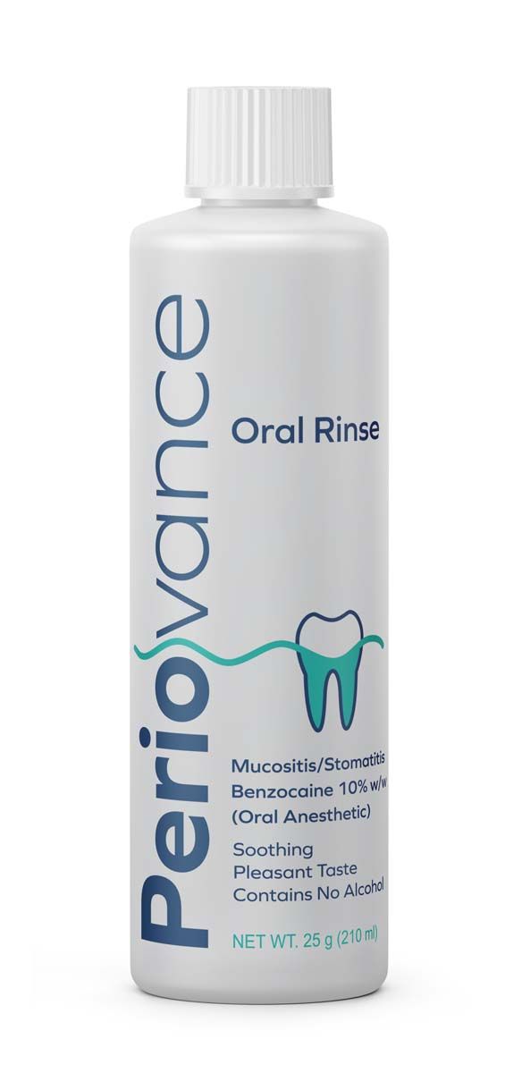 Periovance Oral Rinse features an alcohol-free formula containing key ingredients Benzocaine, Maltodextrin, Aloe Vera Extracts, and Xylitol. These components work synergistically to provide fast pain relief, reduce severity, and enhance the overall patient experience.