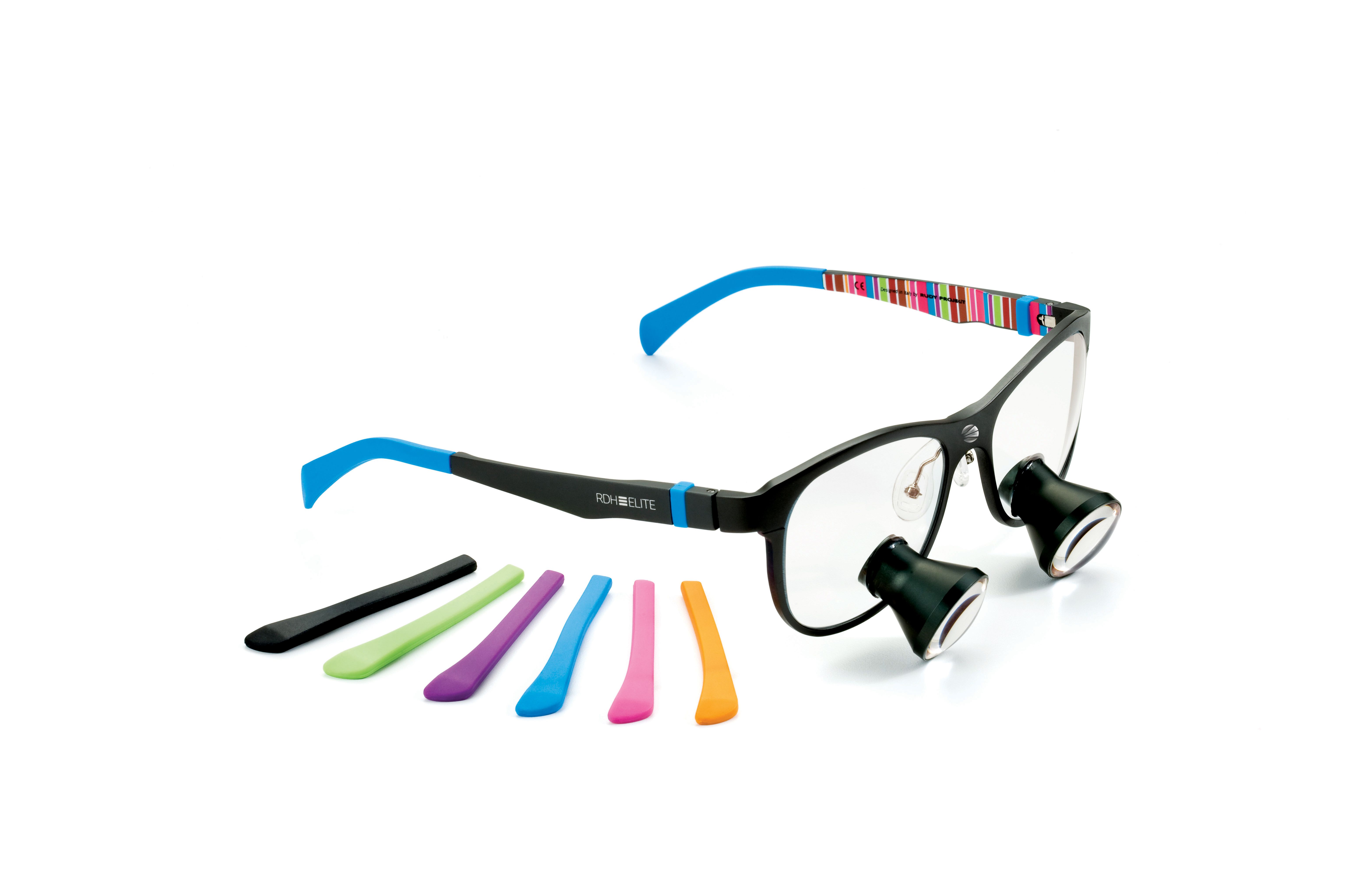 RDH Elite can be configured as a through-the-lens (TTL) or flip-up. Sizes are available in small and regular. Each loupe comes with one interchangeable temple tip and color emblem kit; additional kits may be purchased through Orascoptic.
