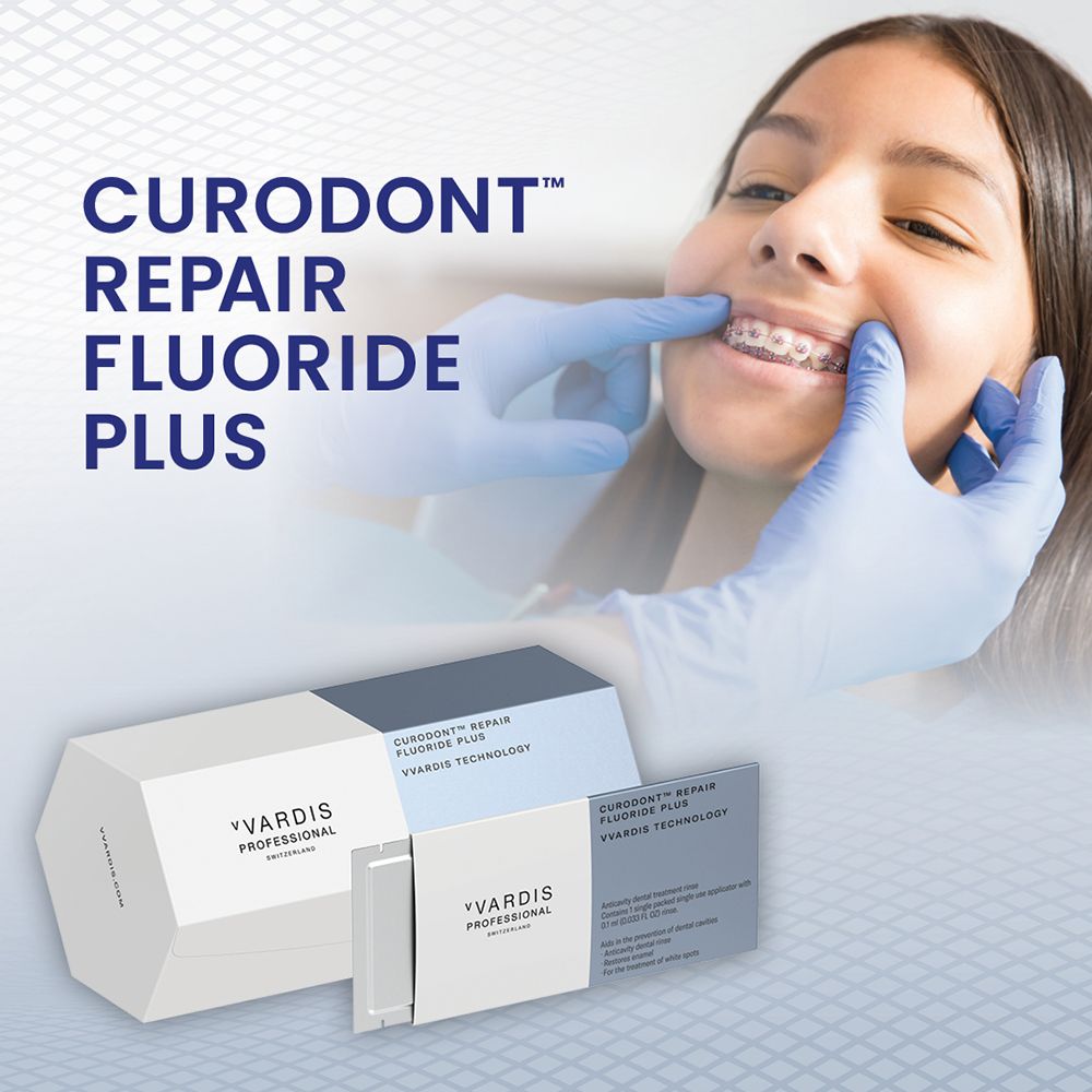 Young Innovations has collaborated with the maker of Curodont Repair Fluoride Plus, vVARDIS, a cutting-edge oral care manufacturer based in Switzerland, to bring this product to market in the US.Orthodontists or trained hygienists can easily apply this therapy to remineralize white spots around brackets on patients who wear braces.