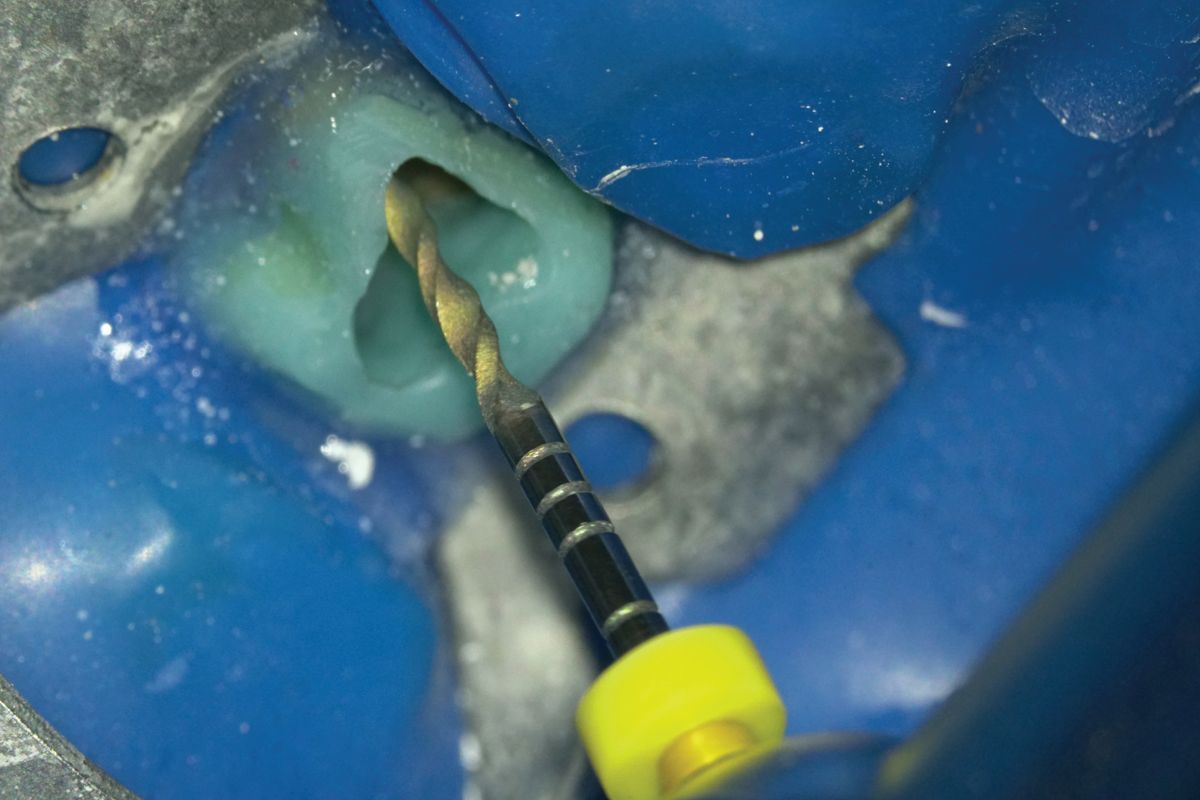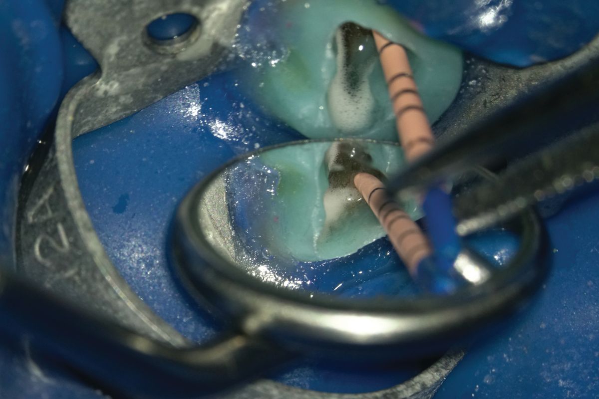 The process of disinfecting and treating the root canals was completed. A self-etch, dual-cure bonding material was applied within the initial core buildup and the canals. After dispensing the Encore D/C dual-cure buildup material into the distal canal, a glass-fiber post was positioned (Figure 6).