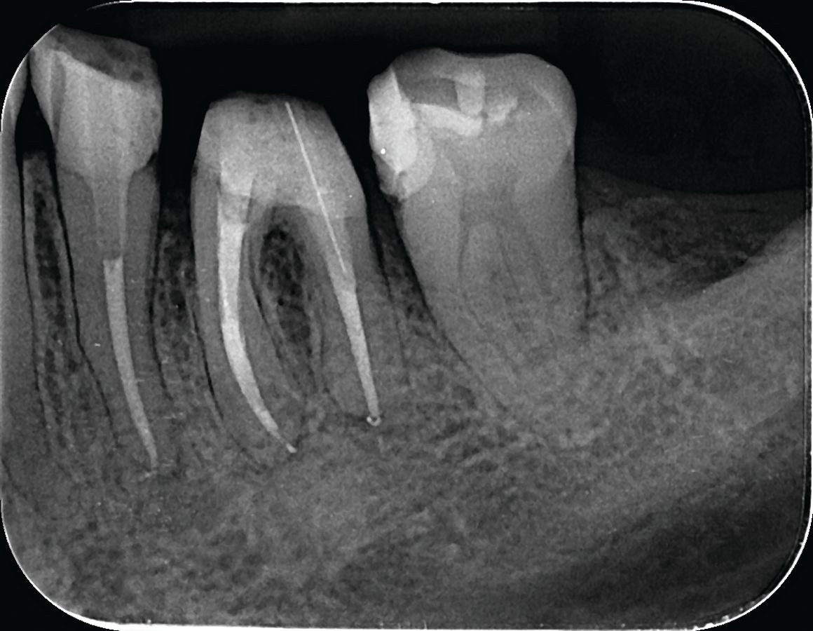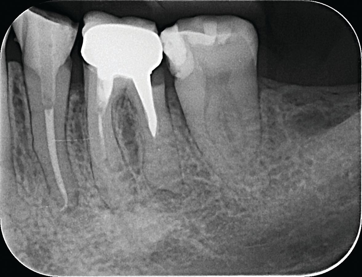 A 46-year-old woman presented to our dental clinic complaining of pain during chewing and a persistent “bad smell” emanating from tooth #19. Radiographic examination revealed a periapical lesion and subgingival distal decay (Figure 1). Additionally, the tooth was tender upon percussion, indicating an acute issue that needed immediate attention.