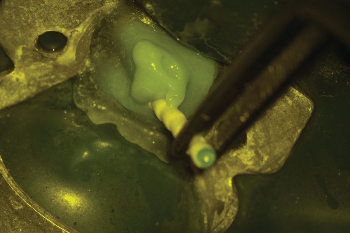 Working through a microscope, the orange-colored light filter was activated on the microscope to prevent the white light of the microscope from prematurely curing the material, thus allowing adequate time to place the glass-fiber post (Figure 7).