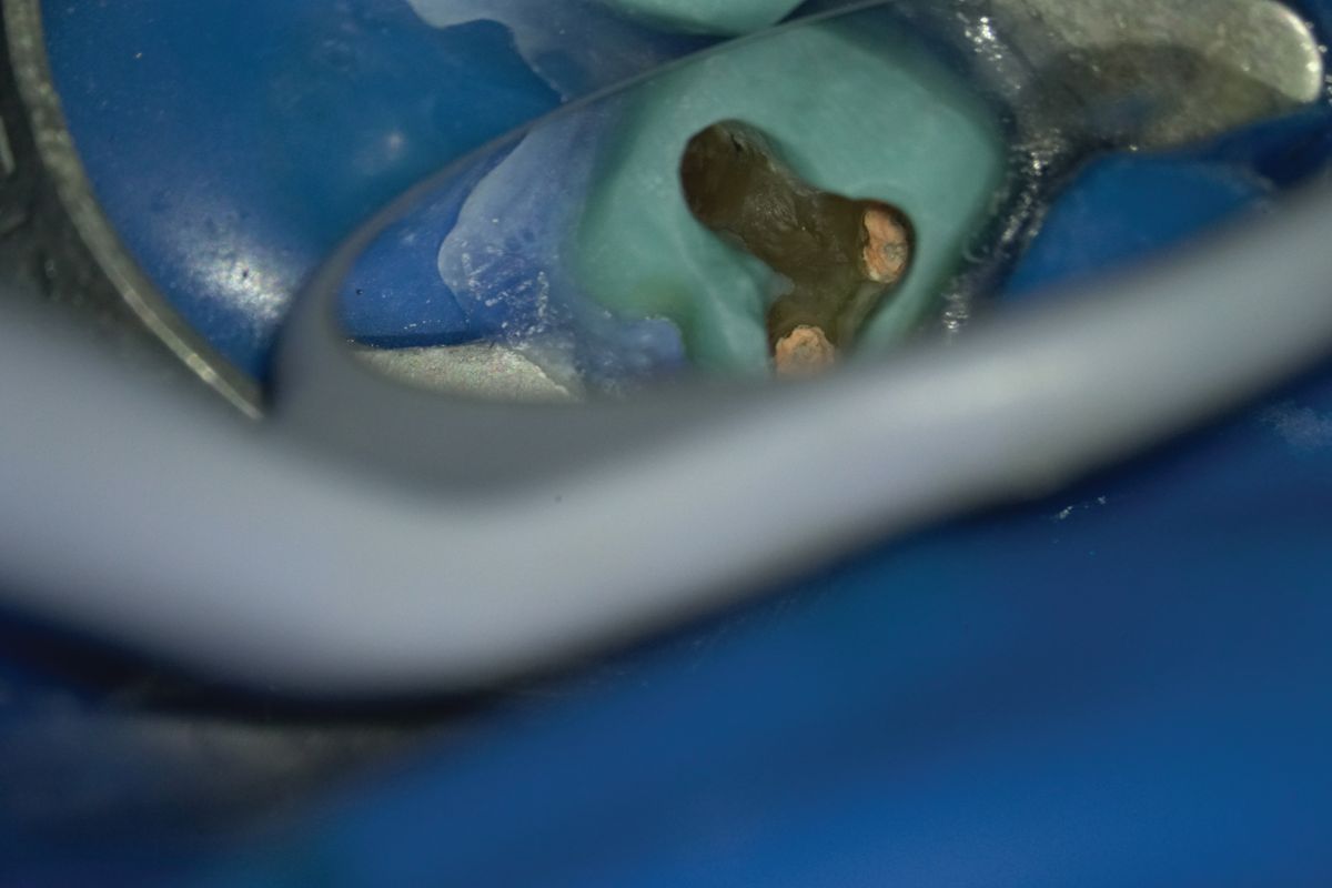 The treatment procedure involved 4 critical objectives: addressing subgingival caries, removing the cast post, building up the core, and starting root canal therapy. Our first step involved the atraumatic removal of the preexisting crown and exposing the cast metallic post, which had to be cut in half and removed. A gingivectomy was performed to access the distal subgingival decay using a ceramic bur without coolant to aid tissue hemostasis. A rubber dam was placed prior to the core build-up and reconstruction of the distal wall.