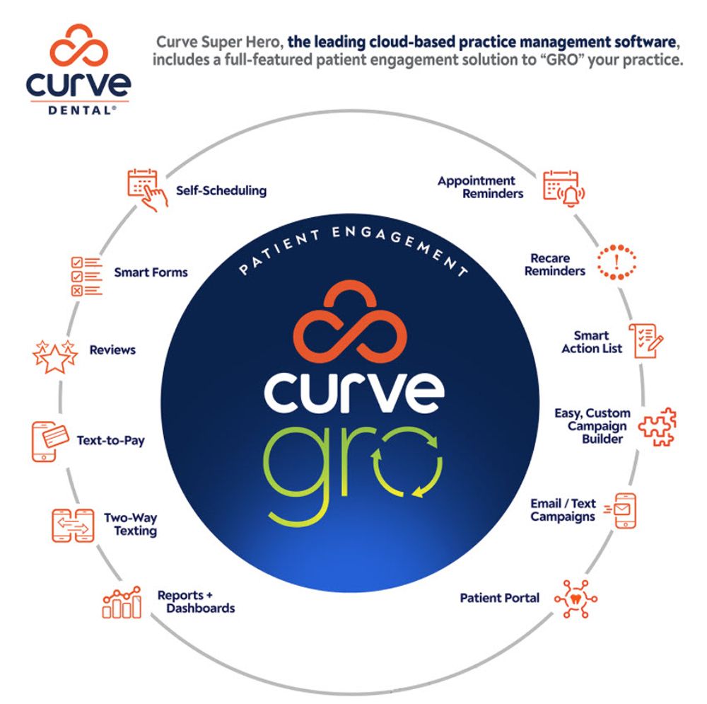 Curve GRO™ is a full-featured patient engagement platform that is part of Curve SuperHero - an all-in-one, cloud-based practice management solution from Curve Dental. Jana Macon, chief operating officer at Curve Dental, says the company’s focus has always been delivering great products and services to customers. “We believe outstanding patient engagement is the best way for practices to set themselves apart and elevate the patient experience.” Macon said. “We intentionally focus everything we do on driving our customers’ growth by improving their workflows, increasing staff productivity, and supporting true work-life balance.”