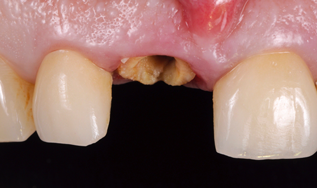The patient is suffering from the continuous decimation of her crown on the central incisor (Fig. 1). Once the crown is removed, we can see that the remaining stump has subgingival margins and the typical appearance of having suffered continued leaks.
