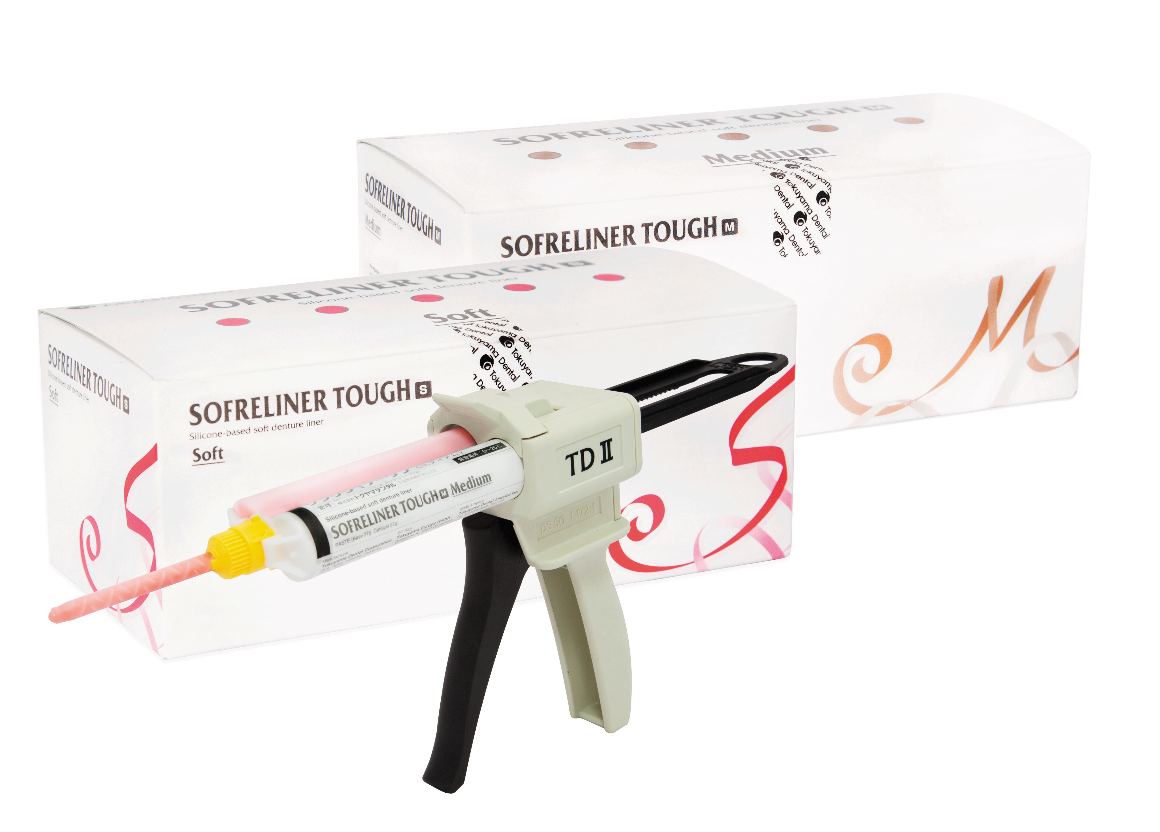 Sofreliner Tough is indicated for use with first time dentures, after surgery, teeth extraction, or implant procedures. Designed for patients experiencing pressure point problems, mucous atrophy, major undercuts, or improved suction, it is also well suited for applications that require the optimal balance of longevity and comfort.