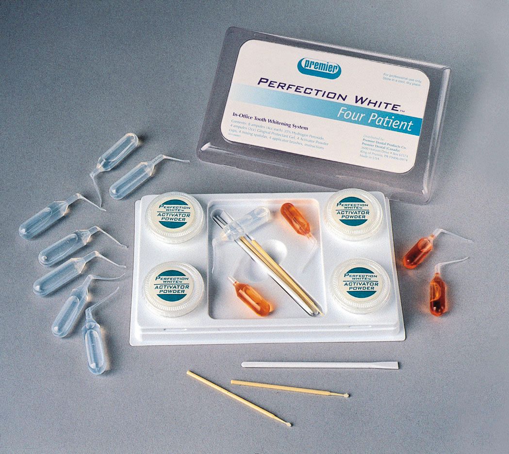 Premier® Perfection White™ is a unit-dosed chairside whitening system sufficient for treating four patients (eight arches). Activator cups containing a proprietary powder formula are designed to increase the effectiveness of the chemical whitening action when mixed with hydrogen peroxide. A one-hour chairtime treatment is said to be all that is needed for your patient’s whiter, brighter smile. Perfection White includes a gingival protectant gel that is to be used with a rubber dam. Light activation or refrigeration is not required.