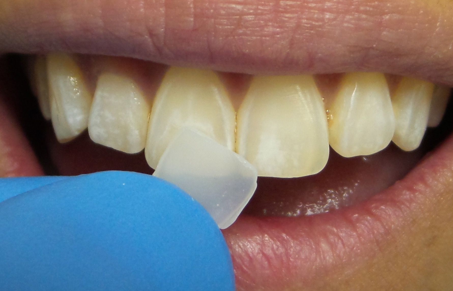 The following photographs demonstrate a case where the ProVeneer System achieved the final results before the patient chose to have work done. It also demonstrates how the micro-thin veneers look once taken off the tooth as well as how the patent pending Smile Preview Veneer blocked out the underlying hypocalcification spots (without requiring tooth reduction, tints or opaquers) and still maintained translucency to achieve a natural looking smile. The Smile Preview Veneer was custom made in minutes per tooth. An additional advantage to the patient was that instead of doing eight to 10 veneers, by combining a few ProVeneers with in-office tooth whitening, the patient left with a radiant, self-confident smile that was very affordable (see photo at top of page).
