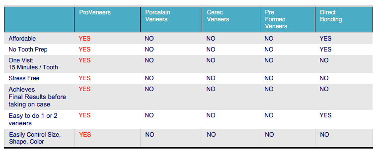 After careful consideration of both professional and patient objections to the treatment solutions offered to solve cosmetic dentistry problems, a new direct veneer system was developed. The following Competitive Matrix should help summarize the current state of the art in cosmetic dentistry.