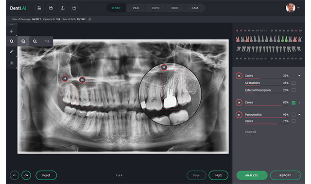 Denti.AI's AI/Machine Learning support tool. Why it's smart: Uses unbiased cloud-based machine learning to identify non-pathological and pathological findings on 2D radiographs.