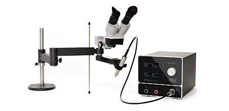 The unit comes equipped with a 10x microscope and built in LCD shutter. The microscope is mounted on a swivel arm for easy adjusting to any user’s height and minimum bench space is needed. The hand piece can either be used in the new and improved holder with high power LED lighting or free hand.