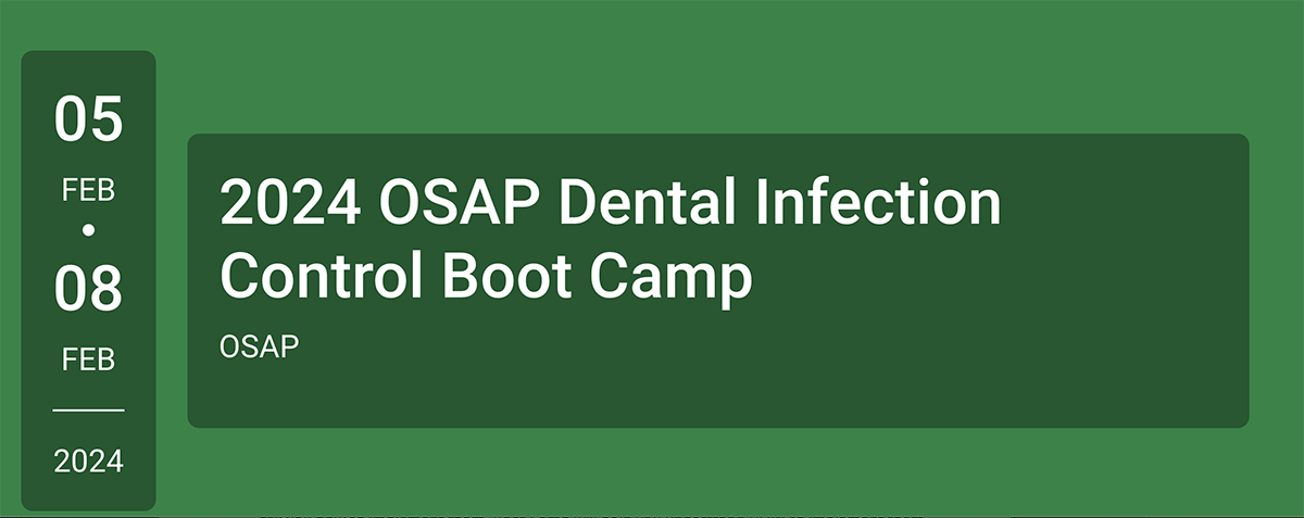 The OSAP Dental Infection Control Boot Camp, held in 2024 in Atlanta, Georgia, in February, is a comprehensive course based on federal standards and evidence-based guidelines. It is ideal for those new to dental infection prevention and safety or those who want to build on, apply, or enhance existing knowledge.