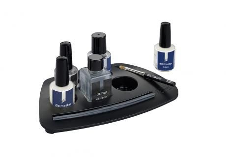 The underlay can be produced in three steps-hardening and sealing with the die:master duo, spacing with the die:master die spacers and separation with Picosep and the brush included in the set.