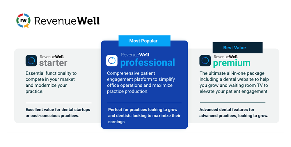 Designed to provide maximum value at reduced costs, while catering to the unique requirements of dental practices at every stage of business maturity, RevenueWell has announced the availability of 3 innovative integrated product bundles: RevenueWell Starter, RevenueWell Professional, and RevenueWell Premium.