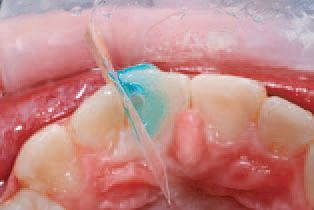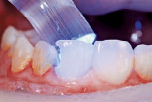 A thin layer of TheraCal LC was placed directly on the pulp and onto moist dentin about 2 mm beyond the exposure and away from the enamel (Fig. 4). Light curing was completed for 20 seconds each from the facial and lingual (Fig. 5). Again, it is important to note that this is a liner and is placed directly over the pulp and onto healthy dentin about 2 mm. This will allow adequate dentin on which to bond for an overall increase in restoration strength.