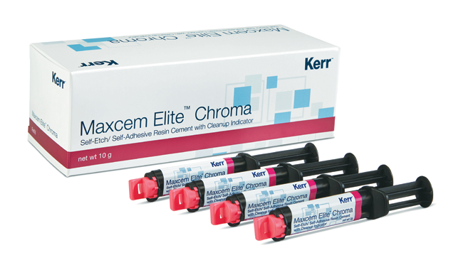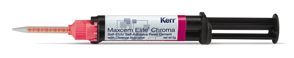 The pink color will disappear after both self-cure and tack cure, allowing for maximum flexibility. In addition to the color cleanup indicator, Maxcem Elite Chroma offers One-Peel™ cleanup, automix delivery system, easy no-refrigeration storage, and compatibility with all indirect restorations.
