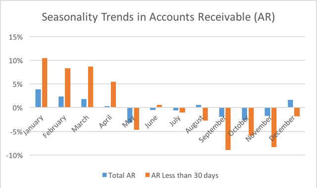 This paper examines accounts receivable under 30 days, as this metric will be more fluid and subject to seasonality trends. The analysis was completed by comparing each month’s national average value to the average monthly value for the entire year. These results are then compared to overall accounts receivable costs.