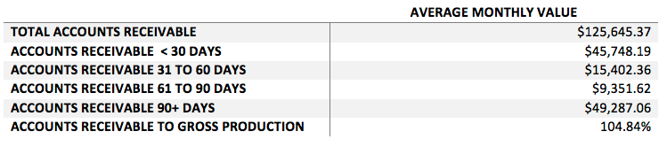 2015 seasonality trends were calculated by tracking the average monthly values of accounts receivable statistics for benchmarking purposes. Total accounts receivable per month averaged $125,645 and represented, on average, almost 105 percent of gross production monthly. This indicates that many practices are carrying high accounts receivable costs.