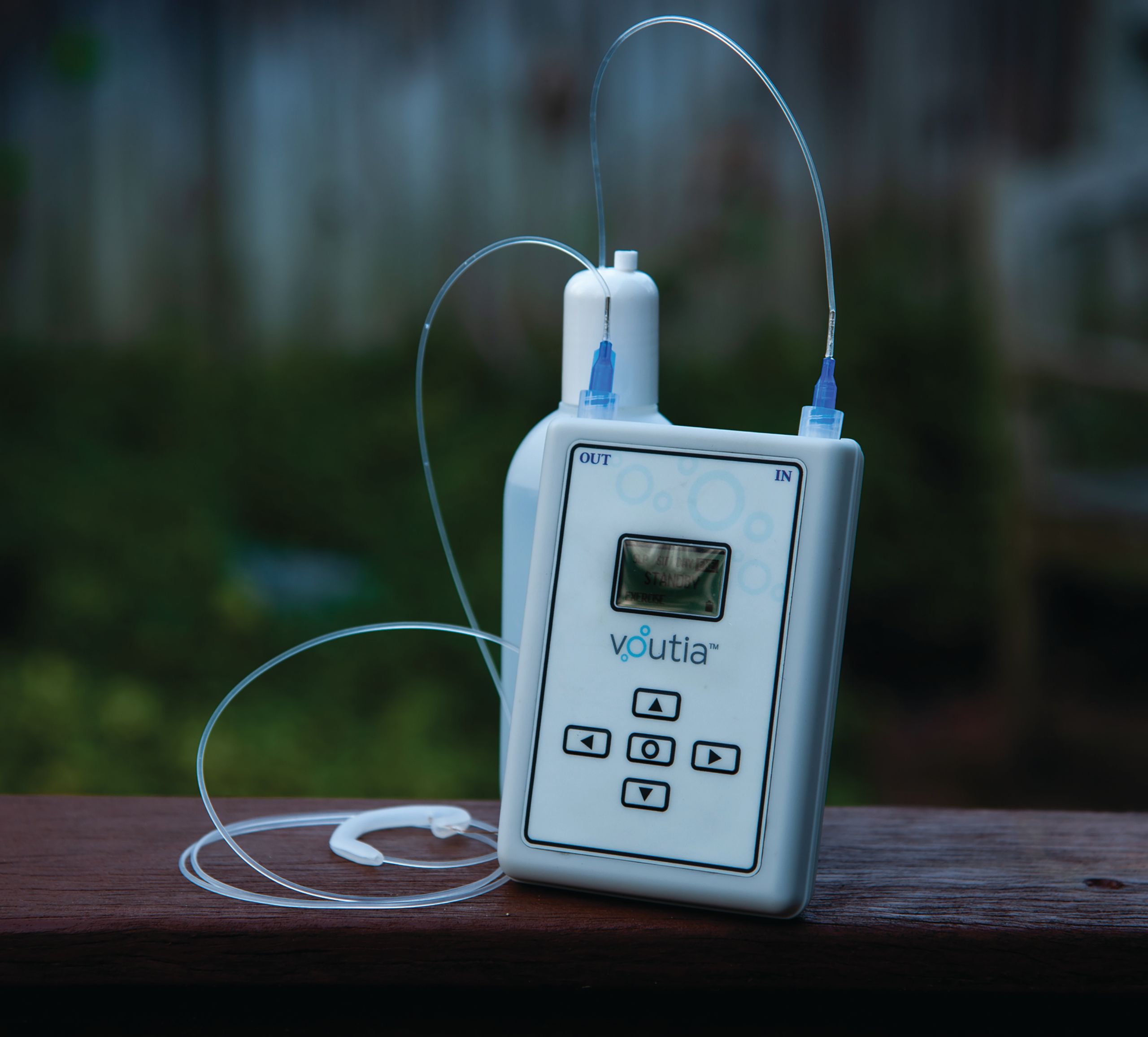 Voutia mimics natural salivary function by providing a slow and measured flow of water to the oral cavity. The device is a patented, US Food and Drug Administration–cleared system that incorporates a quiet, lightweight micropump, a water bottle, and ultrafine tubing to deliver a continuous moisture stream directly to the wearer’s mouth. The device is fully portable and can be used 24 hours per day, 7 days per week—even during sleep. The small earpiece and microtube make Voutia nearly imperceptible during normal social interaction.