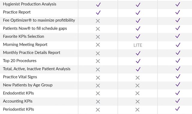 Practice Optimizer Essentials: For dentists looking for an in-depth analysis, insights and actionable data to grow their bottom line, we have developed this version of Practice Optimizer. Features include Fee Optimizer®, to maximize profitability based on fees in the dentist’s zip code, and Patient’s Now®, to fill unexpected and sudden schedule gaps. Prepare for the day with Morning Meeting Report Lite which provides a look at the upcoming day’s schedule. Dentists can also compare practice performance on favorite Key Performance Indicators (KPIs), Top 20 Procedures and total, active and inactive patient analysis.