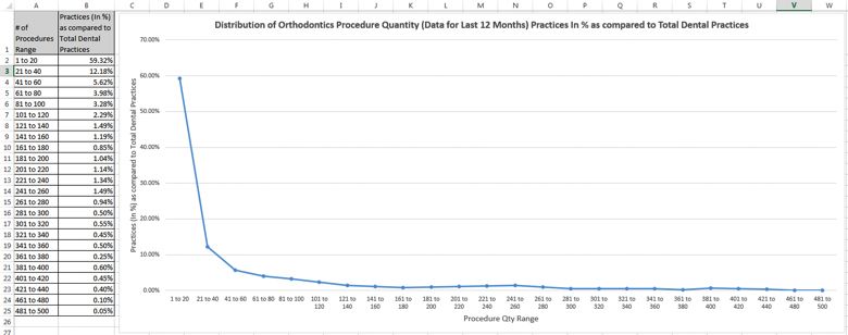 Distribution of orthodontics procedure quantity (data for last 12 months) practices In percentage as compared to total dental practices: