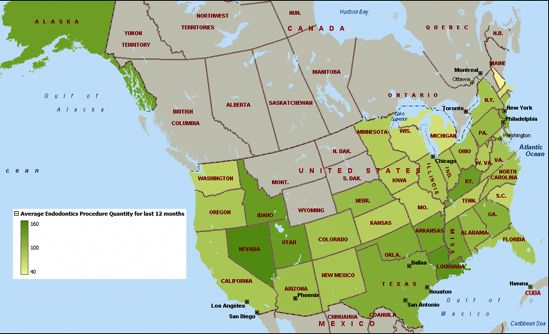 Average endodontics procedure quantity for the last 12 months plotted on U.S. states from more than 12,000 practices: