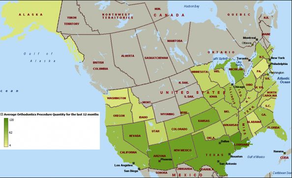 When Sikka plotted the state heat map, for orthodontics, it saw some very interesting trends. Please note the state marked with the gray box is one for which Sikka did not have a representative-enough dataset. Arizona and Louisiana lead in procedures, followed by Michigan, Texas, Nevada, Kansas and New Mexico.