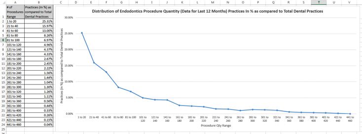 Distribution of endodontics procedure quantity (data for last 12 months) practices In percentage as compared to total dental practices: