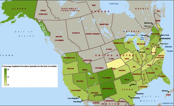According to the ADA CDT code book, implant procedure codes are from D6000 to D6199. New Mexico and Oklahoma top this group with Colorado very close behind.