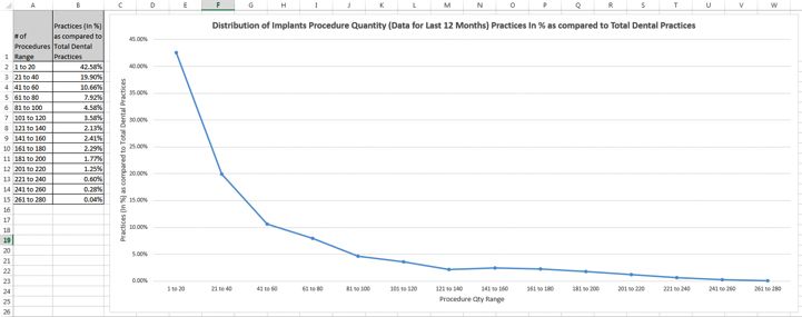 Distribution of implants procedure quantity (data for last 12 months) practices In percentage as compared to total dental practices: