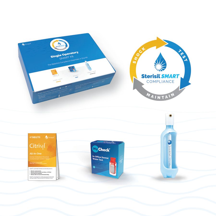 The Sterisil SMART System’s “Shock, Test, Maintain” method is a complete approach to water quality and safety in the dental operatory. It consists of 3 simple steps to help maintain clean and compliant dental unit waterlines and the water that flows through them.