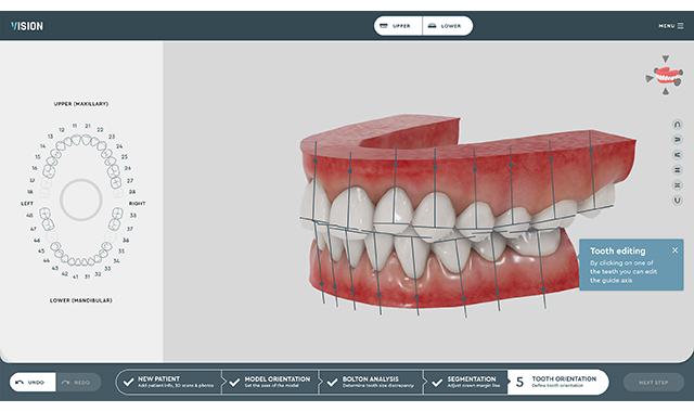 The SoftSmile aligner software helps to create a 3D model of the orthodontic treatment plan, including visualization of teeth roots and movement of the lower jaw during the treatment. It models optimized teeth movement and suggests the exact number of aligners required to achieve the optimized result, supplementing the knowledge of the orthodontist. This software is enhanced by AI, which generates key aspects of a treatment plan. Machine learning algorithms automate the time-consuming processes and facilitate the final setup of aligned teeth based on orthodontic measurements.