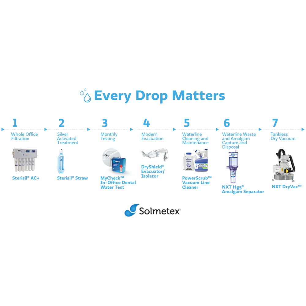 Gagne, Solmetex’s Vice President of Clinical Affairs and Education, says, “Water is one of the most essential elements in the dental office. It is the most used ‘instrument’. Sure, it’s about regulatory compliance, but it’s also so much more than that. Water has direct effects on patients, procedures, and equipment. It should taste clean, fresh, and have no odor. It should be clear of harmful bacteria and help keep the waterlines and vacuum lines free of biofilm buildup that can hinder the effectiveness of instrumentation. We believe in empowering our customers to provide the best possible care to their patients, and the Solmetex System of Water Solutions demonstrates that commitment.”