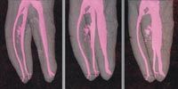 FIGS. 1–2 Radiographs showing an endodontic case that required retreatment (Fig. 1, above). Radiographic evidence colored to highlight the discovery of anomalous pulp stones (Fig. 2, below).