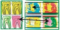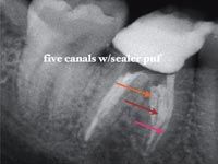 FIGs. 3–4 The roots on this radiograph have been colored to highlight the variety of irregular canal anatomies that are commonly found (Fig. 3, above). Teeth-such as this one with five-can have unusual numbers of canals. (Fig. 4, below).