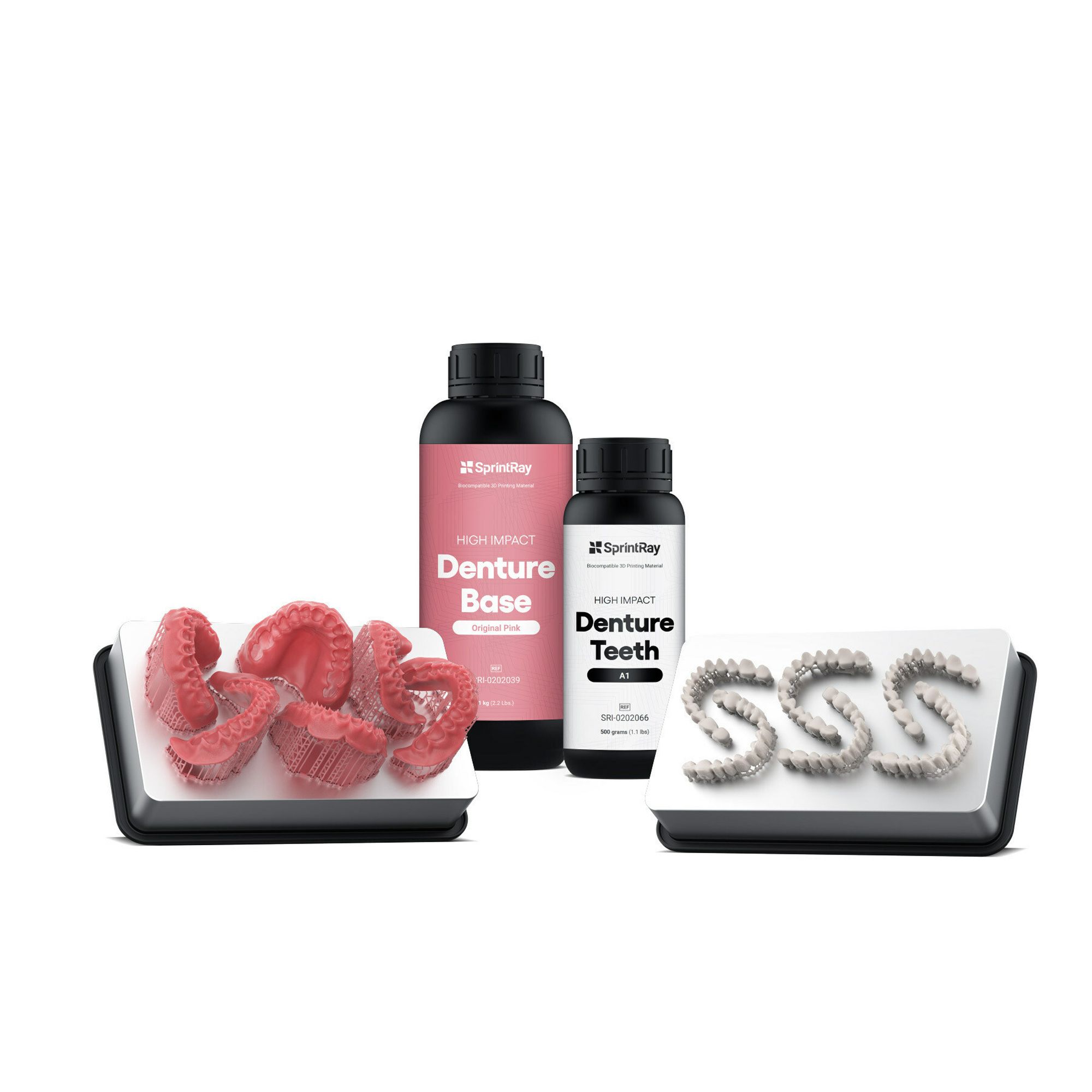 SprintRay is now able to provide custom denture design services with the High Impact Denture Base and Teeth paired with SprintRay Cloud Design. With a design turnaround time of 2 to 3 days, SprintRay is offering an efficient, integrated workflow for dental labs. The new High Impact resins are also fully integrated with the SprintRay 3D printing ecosystem, enabling full denture prints in less than 2 hours.