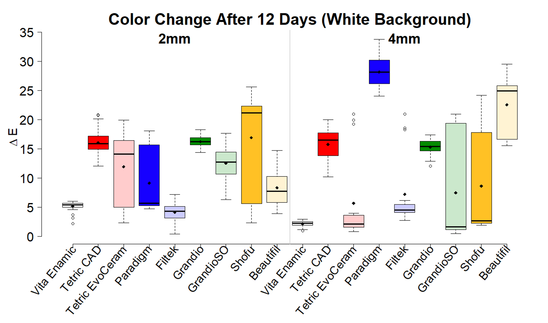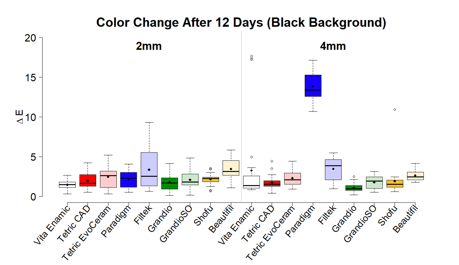 The results from the current study suggest that certain composite materials may not be indicated for esthetic restorations. It is also important to note that there is a significant difference in ∆E values on white and black backgrounds because of increased light absorbance on black backgrounds. White and black backgrounds are clinically relevant, because they simulate different environments. White backgrounds simulate a clinical condition where there are preparation walls, such as a Class I, II, III, or V.3 Black backgrounds simulate anterior restorations such as a Class IV where more light absorbance may occur.3