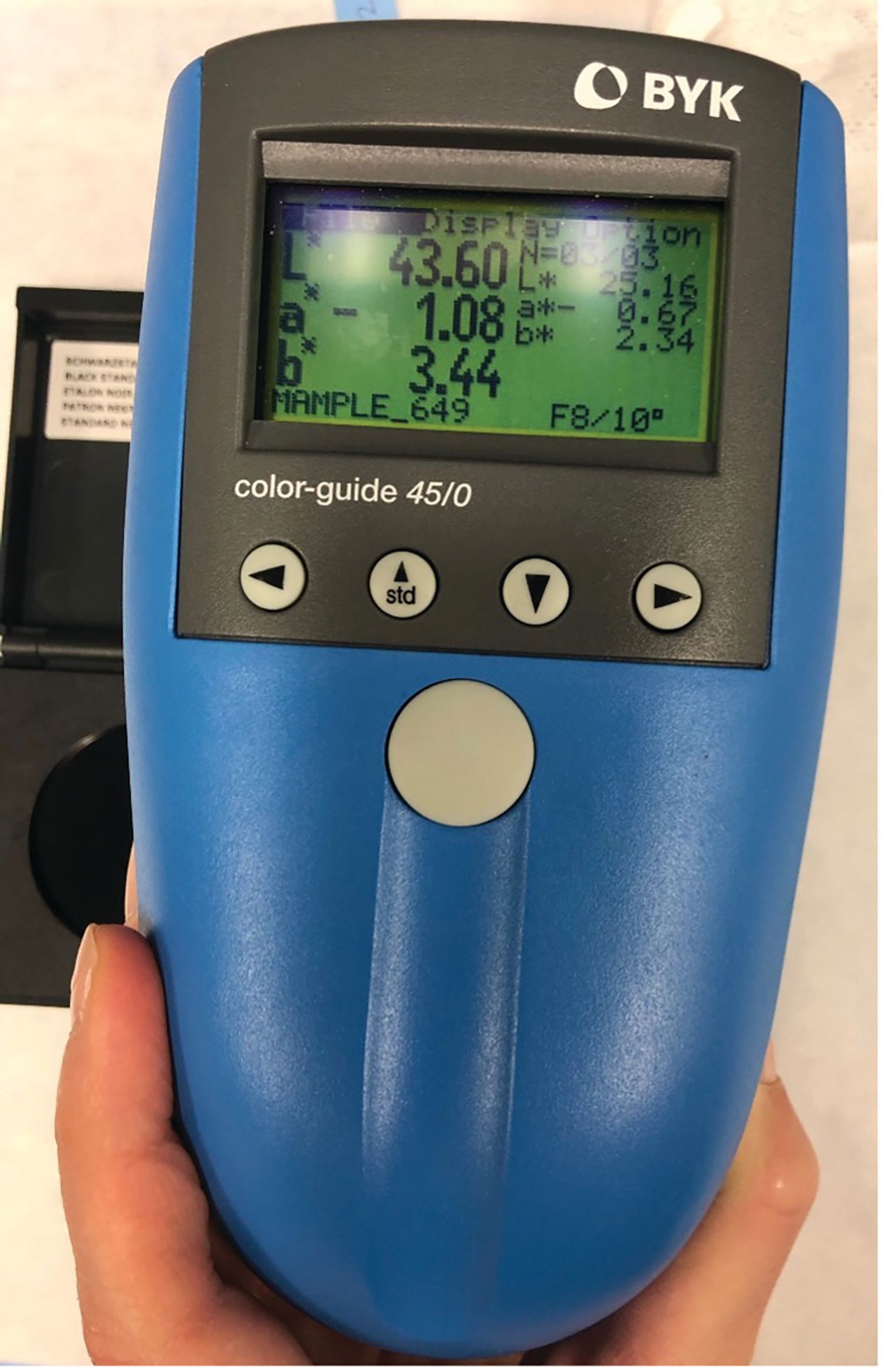 Color parameters (L*a*b*) and tooth shade were measured before and after exposure to the staining solution (Figure 1) using 2 instruments: a BYK-Gardner Color-Guide 45/0 (Figure 2) and Vita Easyshade colorimeter. Measurements were taken against separate black and white backgrounds with samples rotated at 0°, 45°, and 90°. ∆E values were calculated using the following equation: ∆E = [(L1*-L2*)2 + (a1* - a2*)2 + (b1*-b2*)2]1/2.