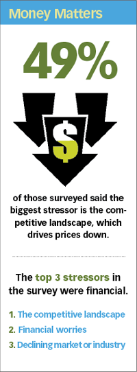 As with any career, money is an important issue-if not the most important. Respondents identified fierce competition and overseas outsourcing as threats to their bottom lines. Forty-nine percent said that the biggest stressor is the competitive landscape, which drives prices down. In fact, of all the 11 stressors presented as options in the survey, the top three were related to finances (the competitive landscape, financial worries and declining market or industry).