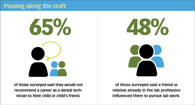 Another very telling question asks, “Would you recommend that your child or child’s friend pursue a career as a dental technician?” Sixty-five percent of respondents said, “no.” It is also interesting, because in another question, 48 percent of respondents said that a friend or relative already in the profession had influenced them to pursue lab work.