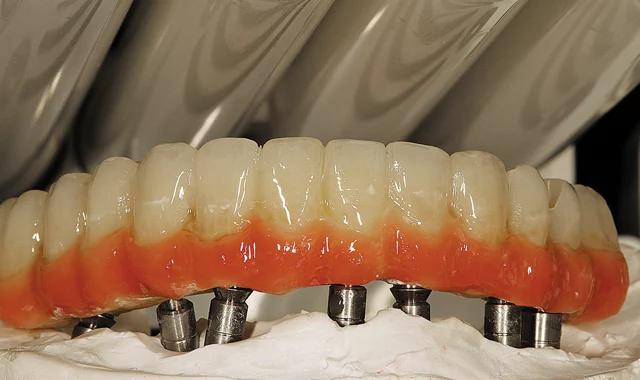 We can utilize technology, especially for implants, to create long-term temporaries through the use of a CAD/CAM machine. A good example of what we can use the material for is with a full-mouth implant case scanned and then copy scanned with a wax try-in already set up.