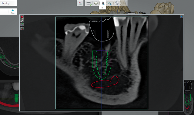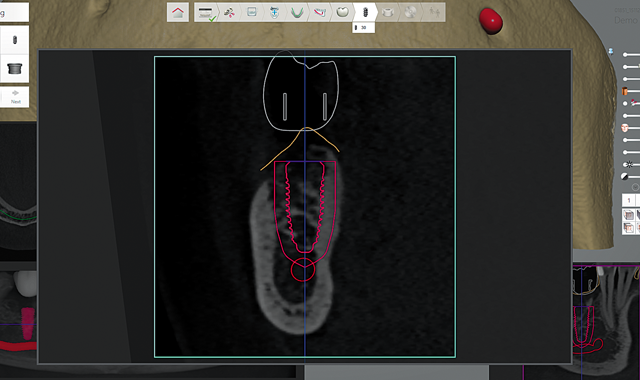 This is very helpful for overdenture cases where direct-to-implant overdenture retention abutments are planned. Having these implants parallel to one another reduces frequency of clinical attachment maintenance. The software changes the color of the implant while planning from green to red if the placement is too close to an anatomic feature that should not be impinged upon (Fig. 8) to help keep the plan and subsequent surgery safe and trouble-free.
