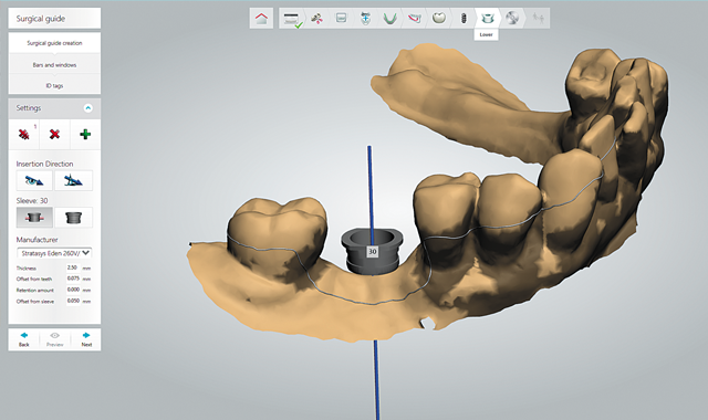 Recently, 3Shape launched a new software module called Implant Studio. This end-to-end solution is built for guided surgery, merging surface scans and CBCT (or CT) scans. Subsequent digital CAD design of the final restoration follows by planning implant placement. Utilizing the combination of the design of the final restoration, the CBCT and surface scans enable a best-in-class plan. This top-down digital workflow is both simple and precise and eliminates the need for manufacturing an appliance prior to and solely for use for the CBCT scan.