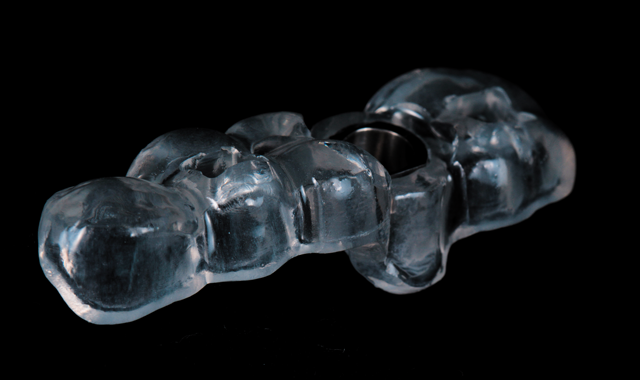 09 Implant Studio outputs an STL file for the surgical guide. For manufacturing, one can use a five-axis mill and clear PMMA disc or a 3D printer. We use both manufacturing technologies with no significant difference in the end product. For milling, we use the Roland DWX-50 and the new DWX-51D. For printing, we use the Objet Orthodesk with the clear bio-compatible MED610 print material. Once the guides are milled or printed, the final step is bonding in the titanium drill guides (Fig. 12). This is achieved using Multilink Automix adhesive (Ivoclar Vivadent) and following manufacturers recommendations for technique. The Implant Studio software provides the part numbers for guide sleeves produced by Steco of Germany and sold in North America by CAP.