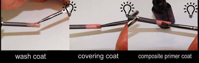 Fig. 4 A thin wash coat is applied and cured for a cycle. A covering coat is then applied to fill in any gray showing through wash and cured. An additional covering coat can be applied and cured if necessary. A final composite primer coat is applied and cured for one minute to prepare for acrylic bond. Light exposure to all sides is critical in obtaining a uniform cure.