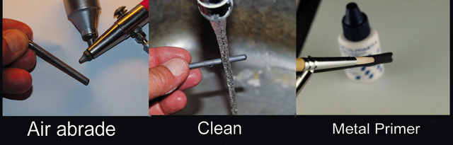 02. First, air abrade the surface with 50-micron aluminous oxide. Then, clean with dry oil free and moisture free air, or water from tap. Do not steam clean. (Do not touch after)
