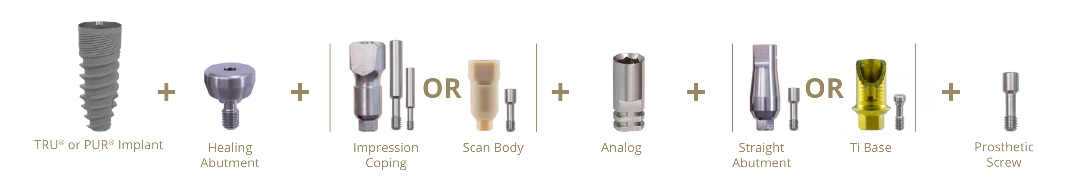 There are three Convenience Bundles available, starting with the standard “All-in-1”: A TRU® or PUR® Implant plus the clinician’s choice of 5 restorative components as befits an analog or digital case. For an Analog case, the implant is bundled with a Healing Abutment, an Open/Closed Tray Impression Coping, a Straight Abutment, an Analog, and a Prosthetic Screw. For a digital case, the implant is bundled with a Healing Abutment, a Scan Body, a Ti Base, and a Ti Base Prosthetic Screw.