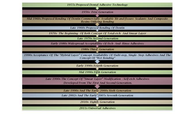 However, this discovery had little practical application until the mid-1950s, when the evolution of dental adhesives took off. These early first-generation discoveries paved the road for amazing advancements, from the no-etch and total etch systems of fourth and fifth generation dental adhesives, to the sixth, seventh and eighth generations of self-etch systems.